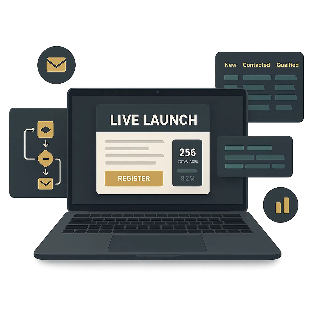 Turn your live event into a revenue-generating machine. From registration to follow-up, your live launch funnel includes a fully built sales page, email automation, and lead-tracking pipeline designed to engage your audience, maximize sign-ups, and convert momentum into sales.